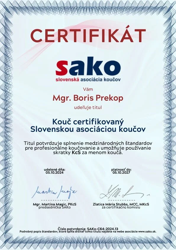 Tento certifikát je slovenským ekvivalentom medzinárodnej skúšky ACC. Znamená potvrdenie mojej profesionálnej odbornosti, ovládanie kľúčových koučovacích kompetencií a dodržiavanie etických zásad.